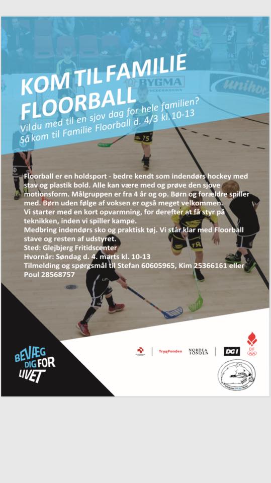 Tag familien med til en hyggelig dag med Floorball. Børn fra 4 år og op kan deltage. Tilmelding skal ske til..
