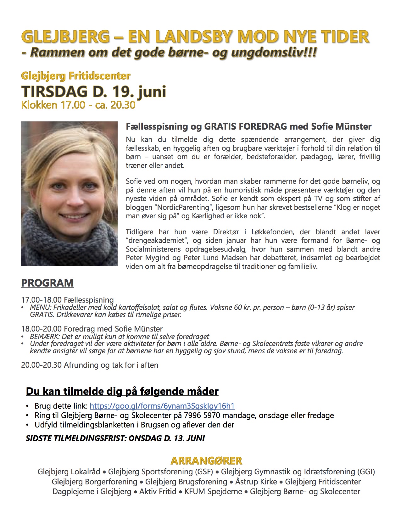 Glejbjergs foreninger, Lokalrådet, Dagplejerne og Glejbjerg Børne- og Skolecenter inviterer til et spændende foredrag med Sofie Münster.
