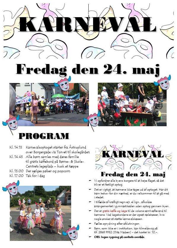 Karnevallet sluttes af med fællesspisning og pattegris på skolens legeplads. Billetter kan købes i Brugsen. Se mere info på plakaten på næste side.