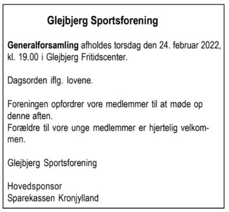 Glejbjerg Sportsforening afholder generalforsamling torsdag den 28. februar kl. 19.00 i klubhuset. Dagsorden ifølge lovene.