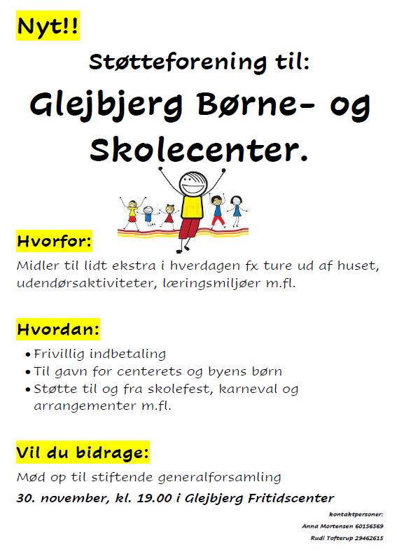 Generalforsamling i Støtteforeningen for Glejbjerg Børne- og Skolecenter i Glejbjerg Fritidscenters cafeteria kl.19.00