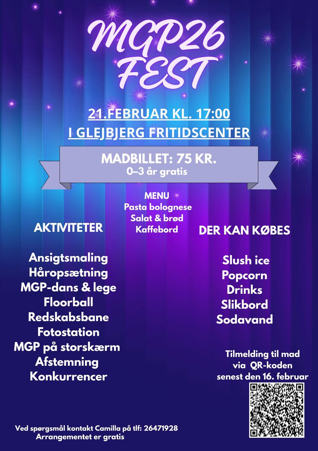 Den årlige MGP-fest afholdes i hallen, med mad og drikke til børn og voksne. Arrangementet er gratis.