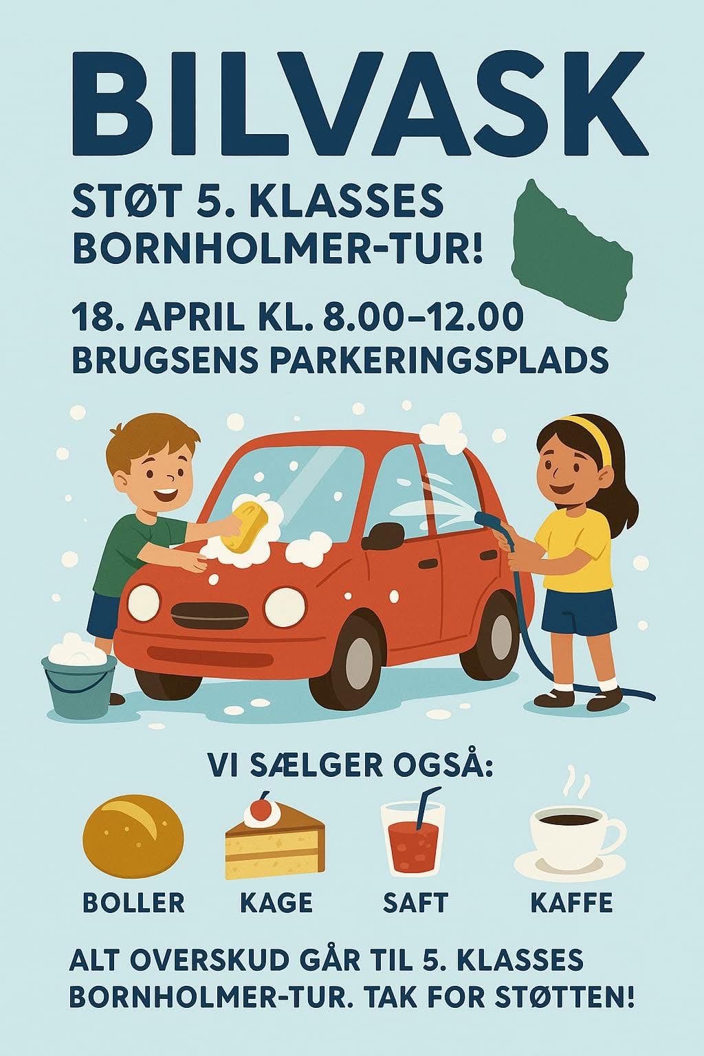 Den årlige bilvask, v. 5. klasse til fordel for deres Bornholmertur. Der kan købes en kop kaffe og et stykke kage...